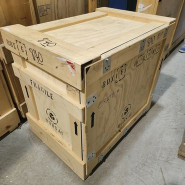 All of our crates are stamped for international travel. We collect only select quality crates from galleries and museums located here in New York City for our inventory.